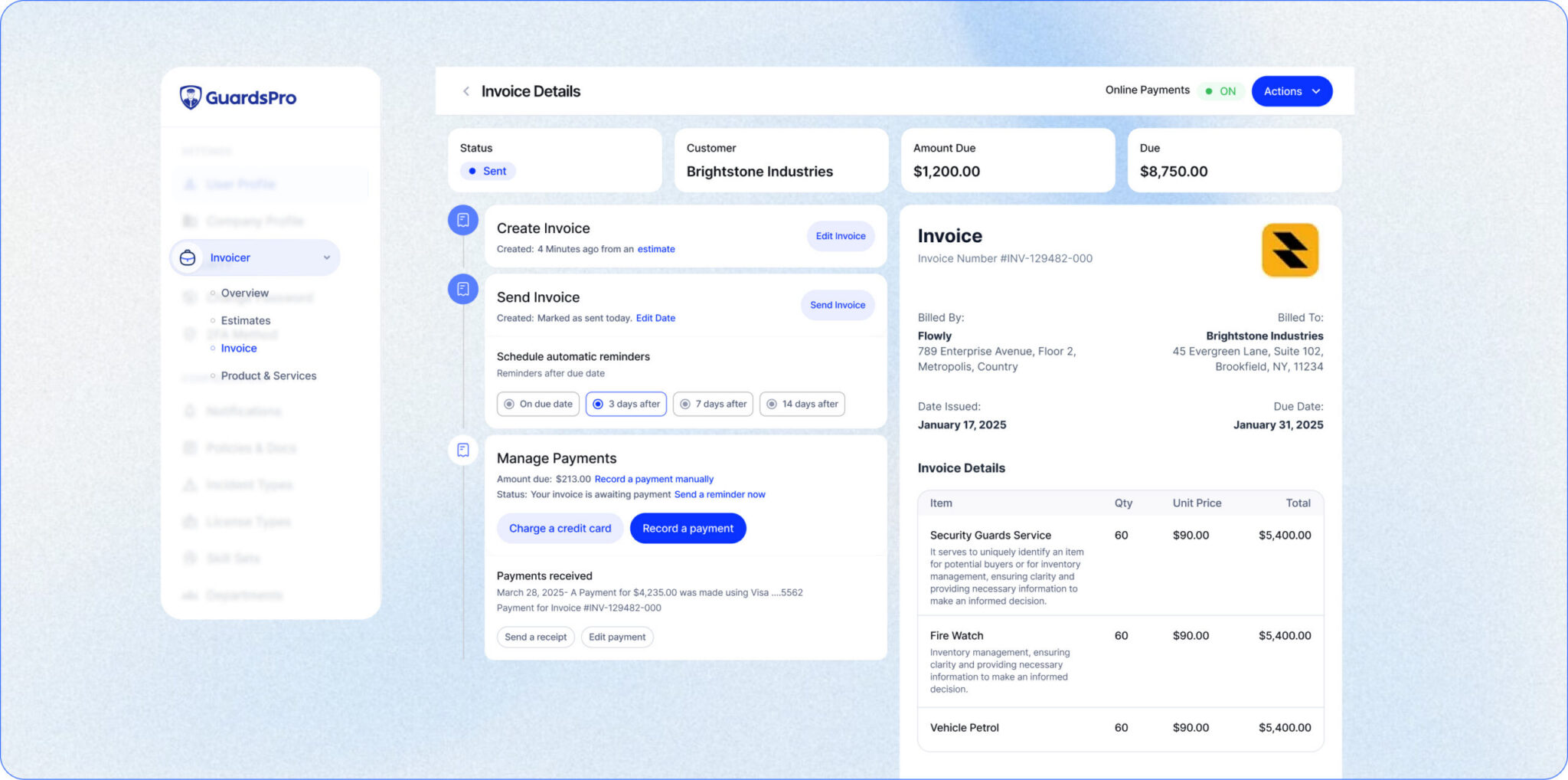 Clients can pay directly through invoices, making the payment process faster and more convenient. This strengthens your security billing automation and improves overall cash flow.